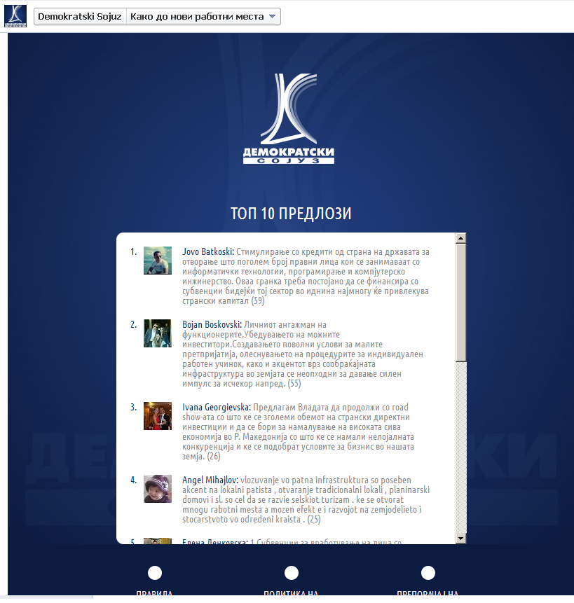 5. Елена Денковска: 1.Субвенции за вработување на лица со инвалидитет 2.Намалување на даноците и стимулација на малите и средни претпријатија 3.Практикантска работа и обука на млади лица 4.Поддршка за развој на туризмот 5.Изработка на план за привлекување на странски инвеститори